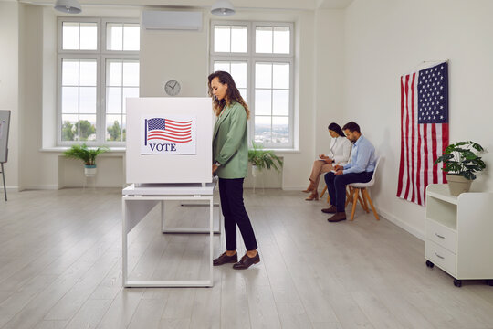 American woman casting vote inside the voting booth at the vote center on Election Day. Iconic American flag, emphasizing the significance of civic engagement and democratic participation in the USA.