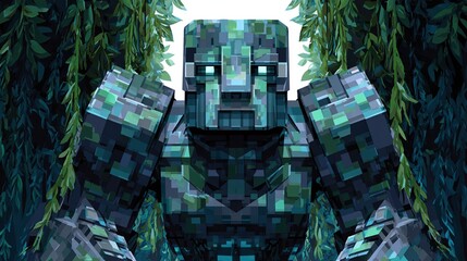 Pixelated, stylized creature, resembling a hulking, armored monster, with a greenish-teal color palette, and light-beige accents, positioned frontally against a muted sage-green backdrop