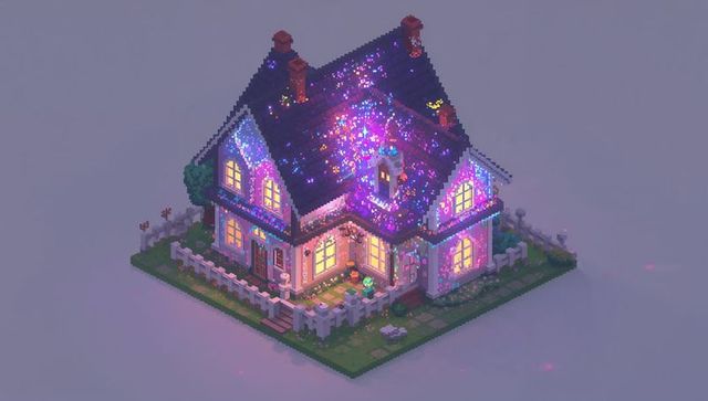Isometric voxel cottage with glowing windows purple sparkling roof cozy twilight diorama