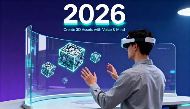 2026 vr developer creating holographic 3d cubes on curved display wearing headset