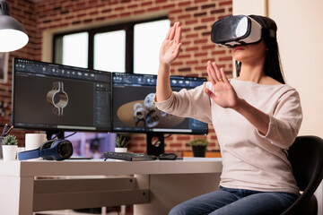 Futuristic vr technology with female engineer testing virtual more features