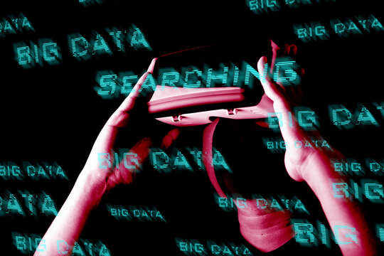 a man wear a VR headset and searching for big data with sci-fi wording graphic