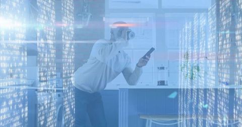 Man wearing vr headset using smartphone in futuristic holographic kitchen with binary code