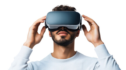 Child boy using virtual reality glasses headset. Kid looking in 3D VR goggles and playing video game. Isolated with white background. Cyberspace and metaverse concept. Generative AI.