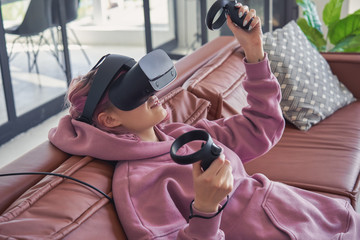 Hipster teen girl pink hair wear vr glasses headset hold controllers play video game simulator enjoy immersive futuristic virtual reality 3D vr travel tour, watch 360 video, shopping on sofa at home.
