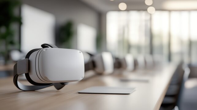 Multiple VR headsets are arranged neatly in a row on a conference room table, indicating a setup for a technology or virtual reality event in a modern office environment.