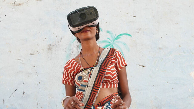 VRデバイスと仮想世界を3D風に表現、宇宙の光を映すヘッドセットと女性の没入体験ビジュアル