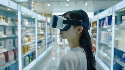 Virtual Reality Shopping Experience Being Tested in a Tech Lab for Digital Marketing Concept