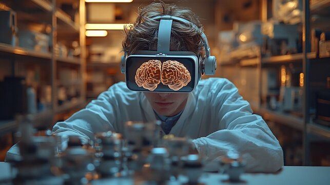Scientist Exploring Virtual Brain Model Through Holographic Interface in Laboratory