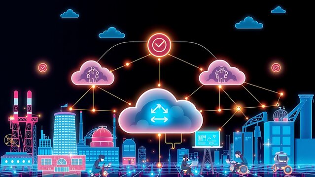 Cloud data management solutions enhancing industry efficiency digital workspace infographic virtual environment aerial view innovation
