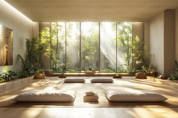 Group practicing tree pose in sunlit glass conservatory with lush plants