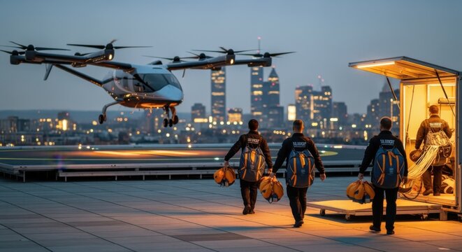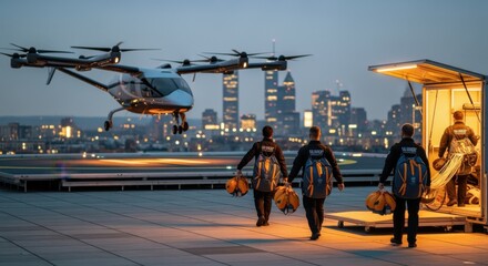 Urban rooftop vtol drone pad at dusk with technicians inspecting autonomous aircraft