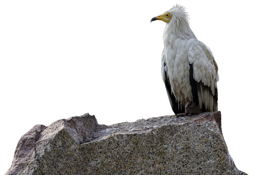 Close up of white vulture Neophron percnopterus looking away and sitting on rock white background proud posture of bird.