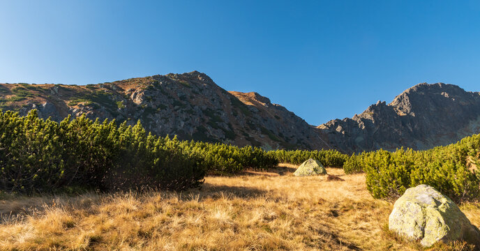 Autumn Furkotska dolina valley with peaks above from Skutnasta polana in Vysoke Tatry mountains in Slovakia
