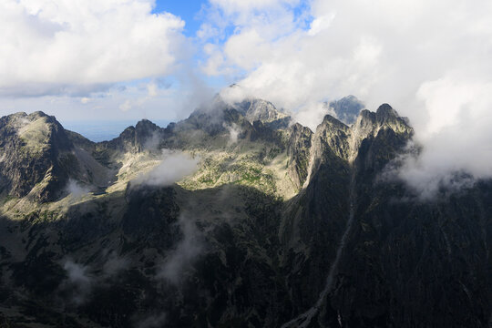Ladovy stit and Prostredny hrot, view from Slavkovsky stit, High Tatras, Vysoke Tatry, Slovakia. Misty and foggy rocky mountains. Top, peak and summit are partly covered by mist and fog on sunny day.