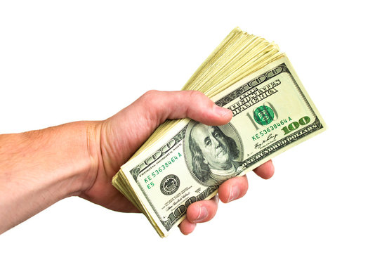 Man hand holding a wad of 100 dollar bills tied with rubber band on isolated background. Shallow dept of field. Including clipping path.