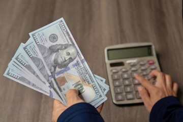 Close-up photo of a person's hands using a calculator and holding a wad of cash on a wooden table. Financial concept.