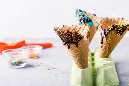 Preparing chocolate dipped ice cream cones with candy  sprinkles