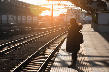 Young woman asian with backpack at the train station. Travel concept.
