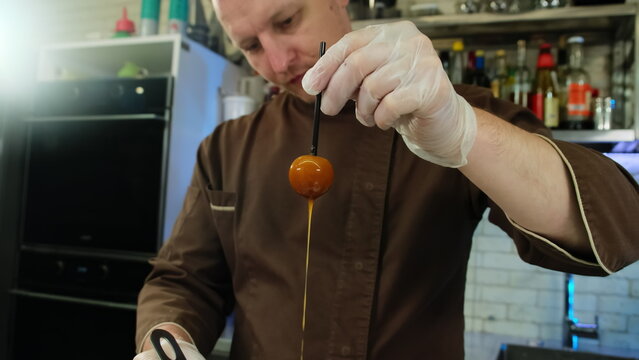Man in latex gloves keeps candy stick in caramel with hand. Chef plunges candy into caramel waiting till caramel stops dropping