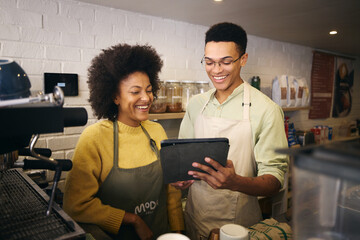 Two Mixed raced baristas doing the budgeting on a tablet