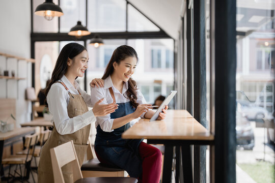 Two smiling Asian waitresses engaging with a tablet in a bright, modern coffee shop, discussing their work and planning the day ahead while enjoying a cheerful atmosphere
