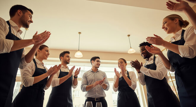 Restaurant manager briefing waitstaff team before service