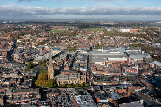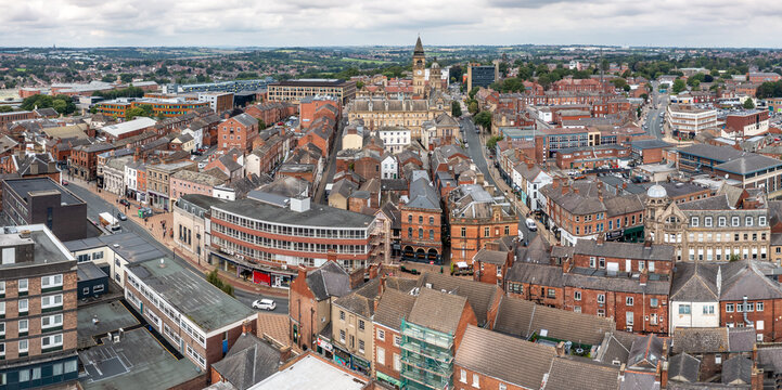 Aerial panorama of Wakefield city centre in West Yorkshire