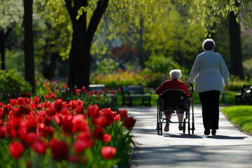 nurse walking alongside a senior citizen using a walker, in a sunny park filled with benches and flowers