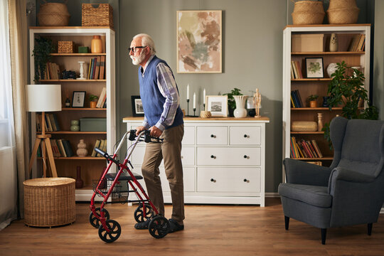 Senior man with disability using walker assistance at home