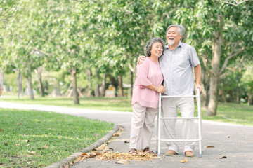 Asian senior couple talking a walk with walker in the park
