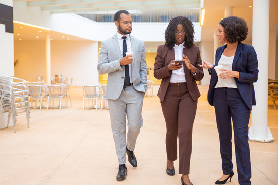 Serious successful team discussing work issues while walking through office hallway. Business man and women using mobile phone, drinking coffee and talking. Teamwork concept