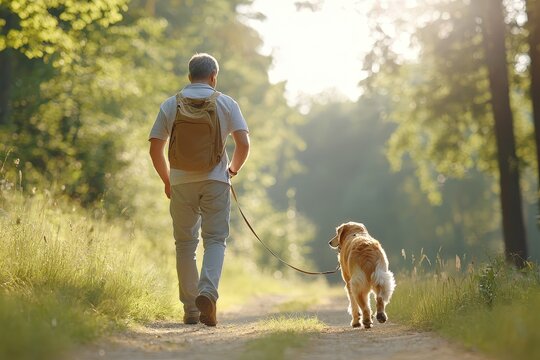 Man hiking through pine forest walking golden retriever on leash carrying backpack at sunset