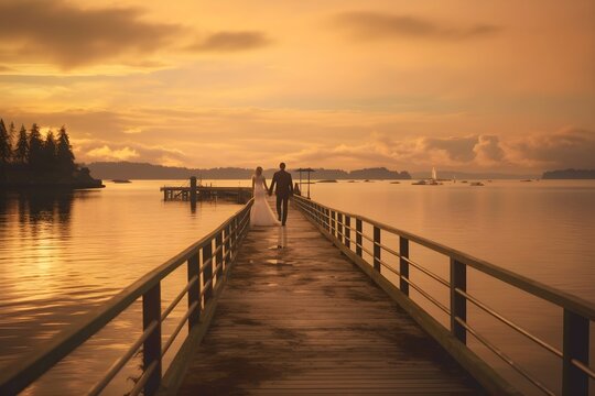 A bride and groom walking on the wooden jetty near the water during sunset