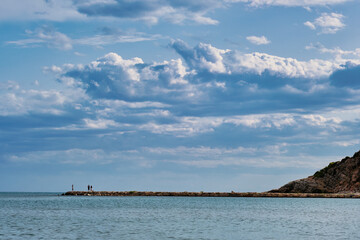 Coastal view of Peñiscola with people walking on the jetty and clouds in the sky during daytime
