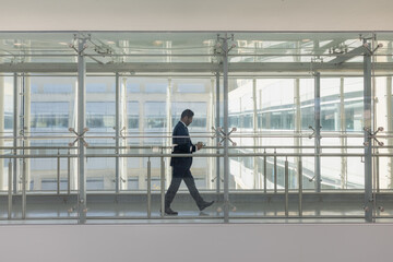 Businessman holding smartphone in modern office atrium