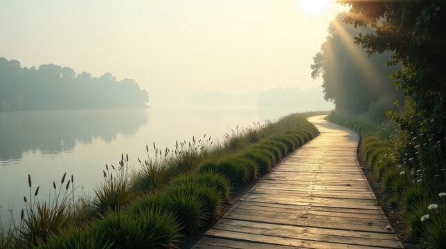 Serene sunrise path alongside calm water, sun rays illuminating a wooden walkway