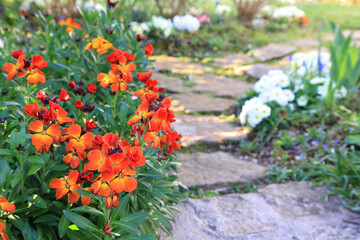 Colorful orange wallflower and white flowers of primula lining a garden path in spring sunlight