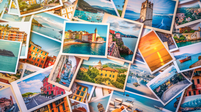 Pile of colourful holiday postacards and photos from beautiful touristic places in Europe, vintage travel concept, summer vacation background