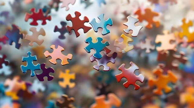 Floating Puzzle Pieces: Colorful puzzle pieces floating in mid-air, starting to connect, creating an abstract pattern that is still forming.
