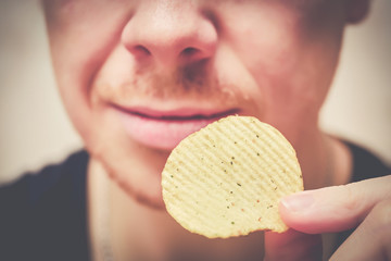 A man wants to eat chips by bringing to his mouth. Toned.