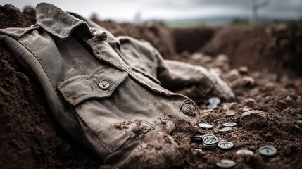trench. A faded military jacket discarded in muddy soil near a trench with scattered buttons. event key visuals, club posters, designed for fitness apps and gym onboarding, used by fitness trainers.