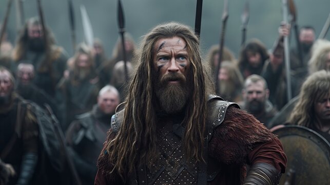 Man long hair and beard stands confidently in front army of male warriors, reminiscent movie scene