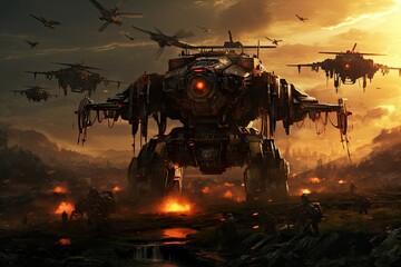 War Concept. Military silhouettes fighting scene on war fog sky background, World War Soldiers Silhouettes below Cloudy Skyline at sunset. Attack scene. Armored vehicles.