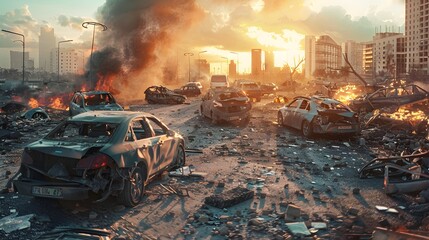 War city, damaged cars and building destroyed world, chaos, war time, destruction, fear, smoke, HD, wallpaper banner