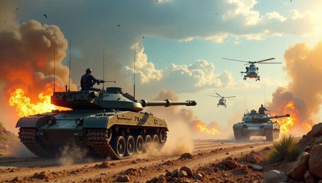 Military tank on the street among the ruins of the ruined city on the background of a powerful explosion, fire and puffs of smoke