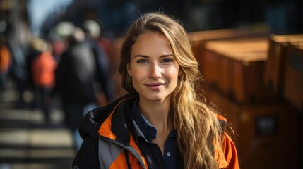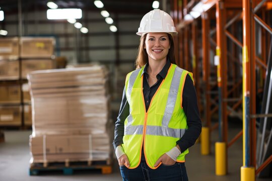 Woman in safety vest and hard hat stands confidently in warehouse with stacks of cardboard boxes. Yellow vest, gray warehouse, orange cones. Professional woman, happy, smiling, looking at camera.