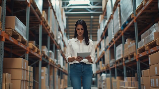 Within a warehouse, a female professional utilizes a tablet for inventory management, ensuring efficient business logistics by checking stock on shelves, enhancing operational efficiency
