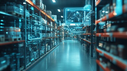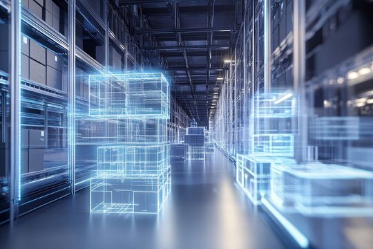 A modern warehouse showcasing advanced technology with digital overlays, enhancing inventory management and efficiency.