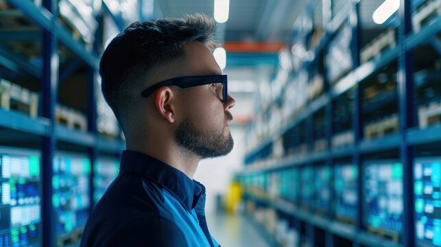 A man is exploring a digitally enhanced warehouse equipped with advanced inventory management systems
